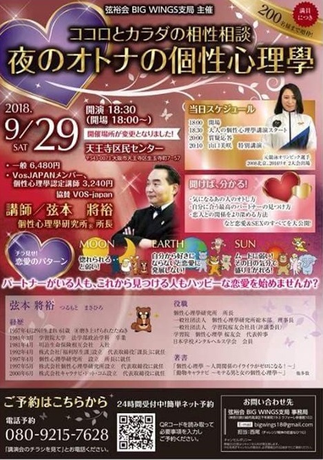 9月29日(土)天王寺区民センターにて、弦裕会BIG WINGS支局様主催の「ココロとカラダの相性相談 夜のオトナの個性心理學」セミナーが行われ、しょうへいくんを救う会の募金箱を設置して頂きました。 講師の弦本先生にも応援、ご協力して頂き、 この度、このような場を設けて頂きましたことを感謝申し上げます。 弦裕会BIG WINGS支局様、弦本先生、ご協力頂いた皆さま、本当にありがとうございました。