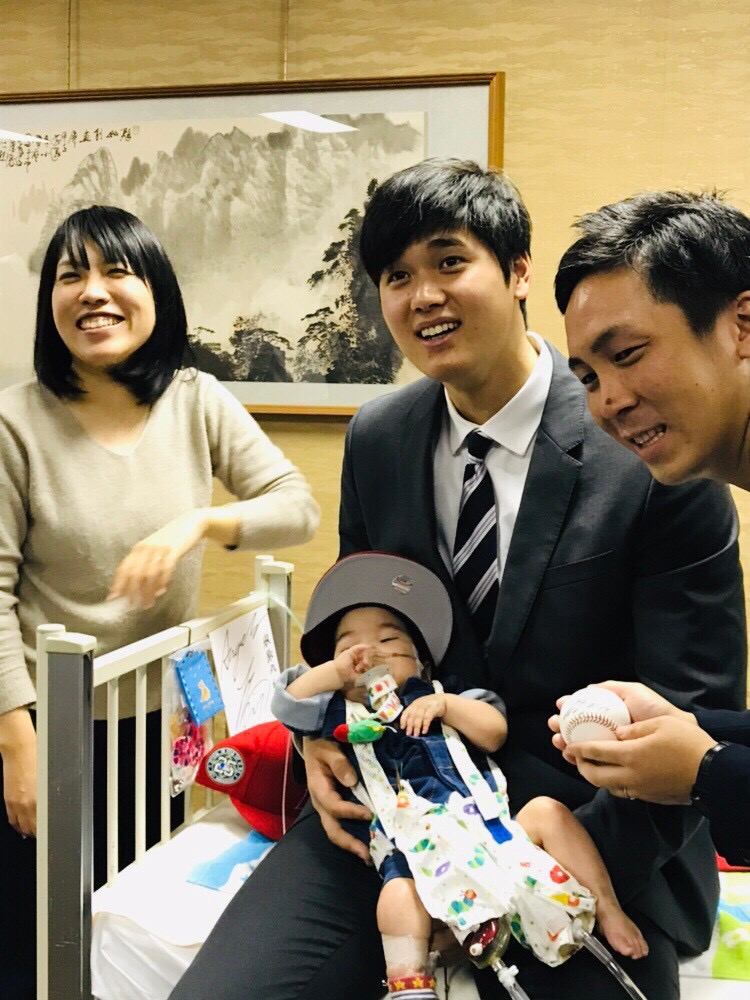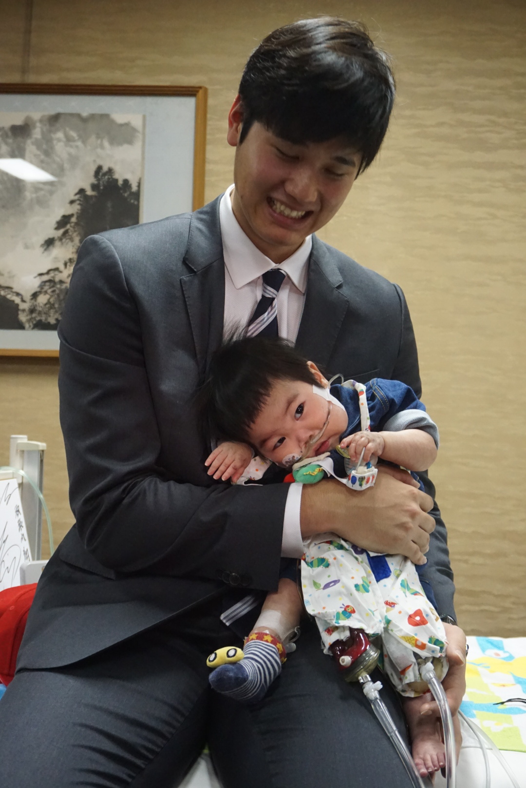 こんばんは。翔平の母です。翔平のことをいつも応援してくださる皆さま、本当にありがとうございます。SNSやメールでのメッセージも、救う会の方々から全て見せてもらい励まされています。おひとりおひとりにお返事が出来ず、本当に申し訳ございません。翔平共々、感謝の気持ちでいっぱいです。皆さまの、応援のおかげで、今を生きていけることに深く感謝申し上げます。そして、私たちの念願が叶いました。メジャーリーグでご活躍中の、エンゼルスの大谷翔平選手が、翔平に会いに病院に来てくださいました。以前、日記で書いたこともありますが…息子の翔平の名前は、病気に負けず、大谷選手のように世界へ翔ける強い子になってほしいと願いを込めてつけました。まさか大谷翔平選手ご本人が自ら翔平の元へ来てくれるとは…優しく翔平を励ましてくれる翔平選手に、元気をたくさん頂きました。翔平が元気になって、これから大きく成長した時、偉大な名前をもらい、心も体も温かく優しい翔平選手のようになりたいと思うはずです。困難に立ち向かい、今まで苦しいことをたくさん乗り越えてきた翔平。ますます翔平の成長が楽しみになりました。たくさん抱っこしてくれました。人見知りもなく、大谷翔平選手のひざの上で終始リラックスな翔平でした。「頑張れって、いつも思ってるよ。」「早く元気になれるといいね。」と翔平にたくさん声をかけてくれました。キョトンとした表情でしたが、翔平選手のお言葉通りに、元気になる日を心から願っております。関係者のみなさま、報道関係各社様、この度はお忙しい中、本当にありがとうございました。このような夢の時間を過ごせたのは、支えてきてくださった皆様のお力があってのことだとたくさんの愛に本当に感謝しております。ありがとうございます。これからも、翔平をよろしくお願い致します。この日の翔平は、お昼ごはんをモリモリ食べて、すぐにお昼寝をしました。マイペースな翔平です。大きく体調を崩すこともなく、次の日もご機嫌良く過ごすことができました。サポートしてくださった、先生方のおかげです。来週は、いよいよ再度、カテーテル検査を予定しております。また結果を報告できたらと思います。一段と寒い日々が続きますが、皆さま、風邪などひかれませんよう、御身体ご自愛くださいませ。翔平の母、静葉